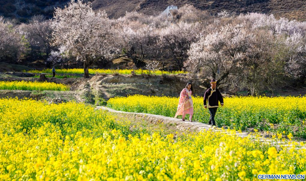 NYINGCHI, 8. April 2026 (Xinhuanet) -- Touristen wandern inmitten blühender Blumen im Dorf Duodang der Stadt Nyingchi im südwestchinesischen Autonomen Gebiet Xizang. April 2026. (Quelle: Xinhua/Tenzin Nyida)