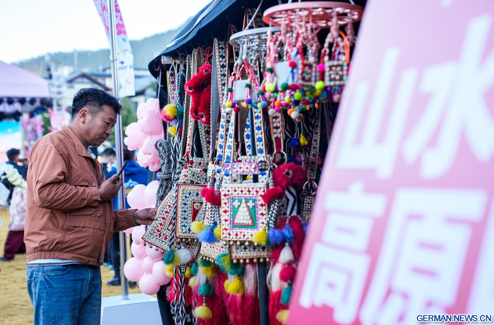 NYINGCHI, 8. April 2026 (Xinhuanet) -- Ein Tourist kauft handgefertigte Taschen auf einem Markt in der Stadt Nyingchi im südwestchinesischen Autonomen Gebiet Xizang, 3. April 2026. (Quelle: Xinhua/Tenzin Nyida)