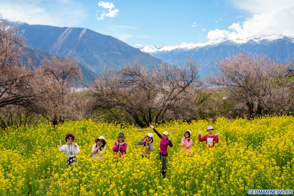 NYINGCHI, 8. April 2026 (Xinhuanet) -- Touristen posieren für Fotos im Dorf Galai der Stadt Nyingchi im Autonomen Gebiet Xizang, 2. April 2026. (Quelle: Xinhua/Tenzin Nyida)
