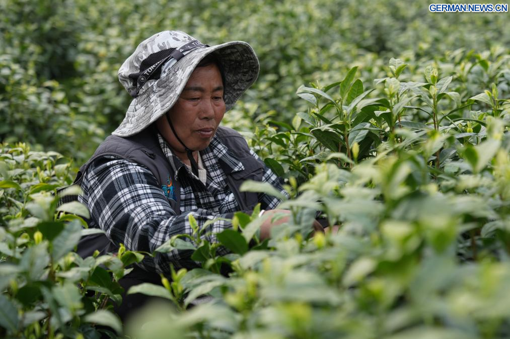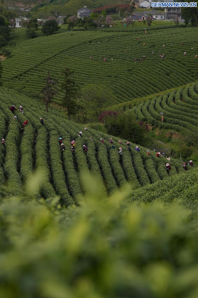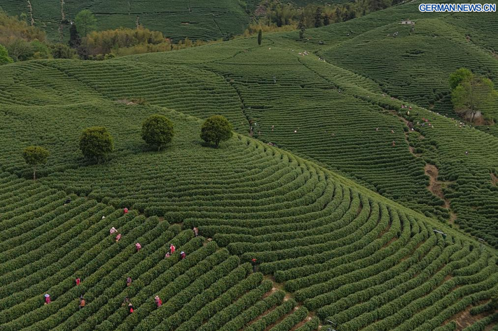 ANJI, 8. April 2026 (Xinhuanet) -- Das am 8. April 2026 aufgenommene Foto zeigt Arbeiter bei der Ernte von Teeblättern in einem Teegarten im Kreis Anji in der ostchinesischen Provinz Zhejiang. Der Weiße Tee im Kreis Anji tritt derzeit in seine Erntesaison ein. Im Jahr 2025 erreichte die Produktion vom Weißen Tee in Anji 2.630 Tonnen, wobei der jährliche Produktionswert der Tee-Industriekette 7 Milliarden Yuan (etwa 1,02 Milliarden US-Dollar) überstieg. Der Kreis verzeichnete im vergangenen Jahr zudem mehr als 5 Millionen Tee-bezogene Touristenbesuche. (Quelle: Xinhua/Huang Zongzhi)
