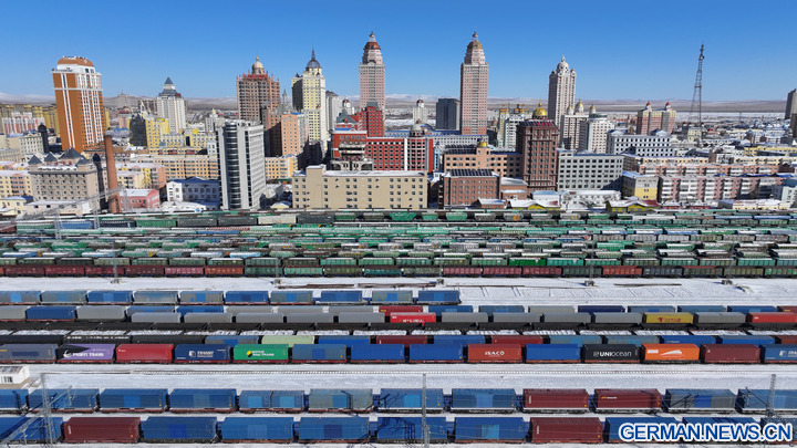 Die Luftaufnahme einer Drohne zeigt China-Europa-Güterzüge vor ihrer Abfahrt am Bahnhof von Manzhouli in der Autonomen Region Innere Mongolei in Nordchina, 26. Februar 2026. (Foto von Huang Xu/Xinhua)