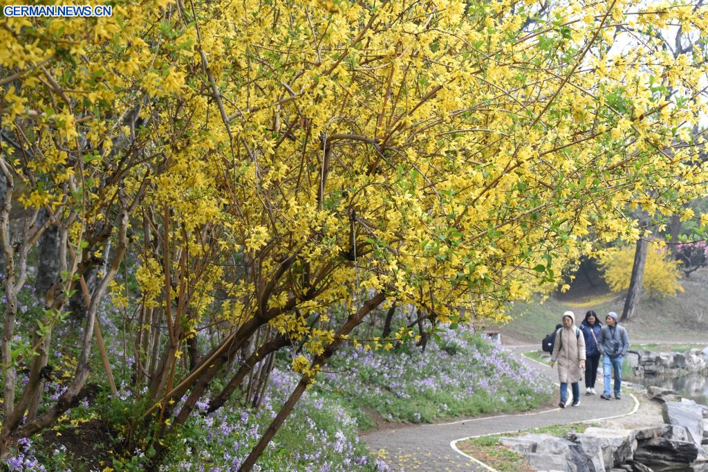 BEIJING, 9. April 2026 (Xinhuanet) -- Touristen besuchen den Yuanmingyuan-Park in Chinas Hauptstadt Beijing, 9. April 2026. Am Donnerstag wurde im Yuanmingyuan-Park ein Frühlingstourismus-Festival eröffnet, das ein immersives Kultur- und Touristenerlebnis bietet. (Quelle: Xinhua/Luo Xiaoguang)