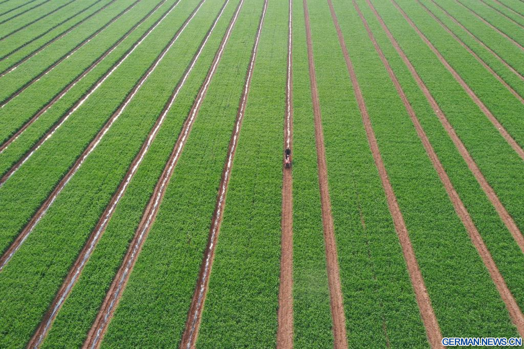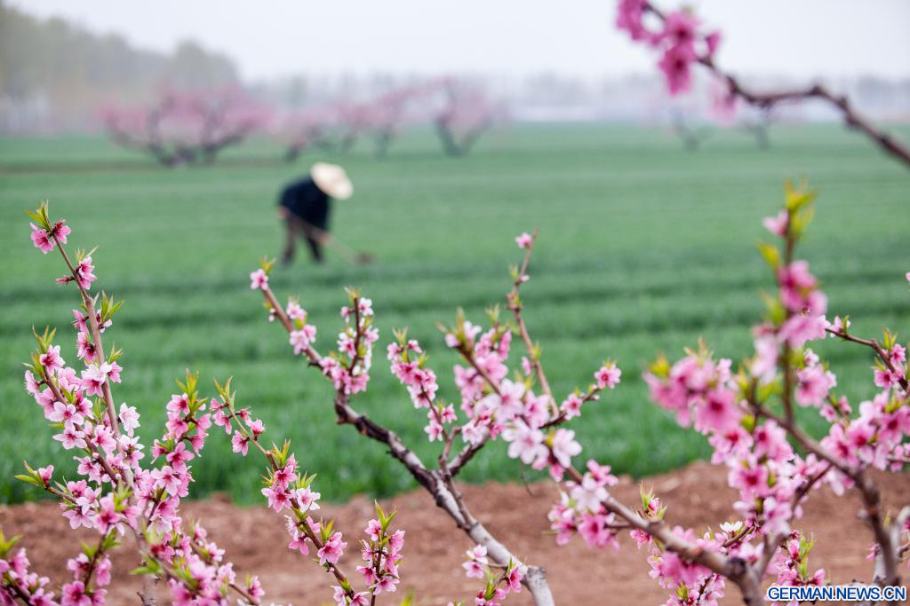 BEIJING, 9. April 2026 (Xinhuanet) -- Ein Bauer kümmert sich um Winterweizen auf einem Feld in Zibo in der ostchinesischen Provinz Shandong, 9. April 2026. (Foto von Zhang Weitang/Xinhua)