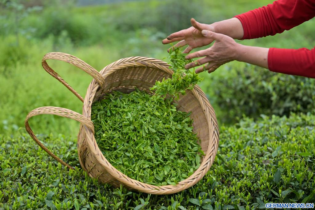 BEIJING, 9. April 2026 (Xinhuanet) -- Ein Bauer pflückt Teeblätter in einer Teeplantage im Kreis Xuan’en in der zentralchinesischen Provinz Hubei, 9. April 2026. (Foto von Chen Xukai/Xinhua)