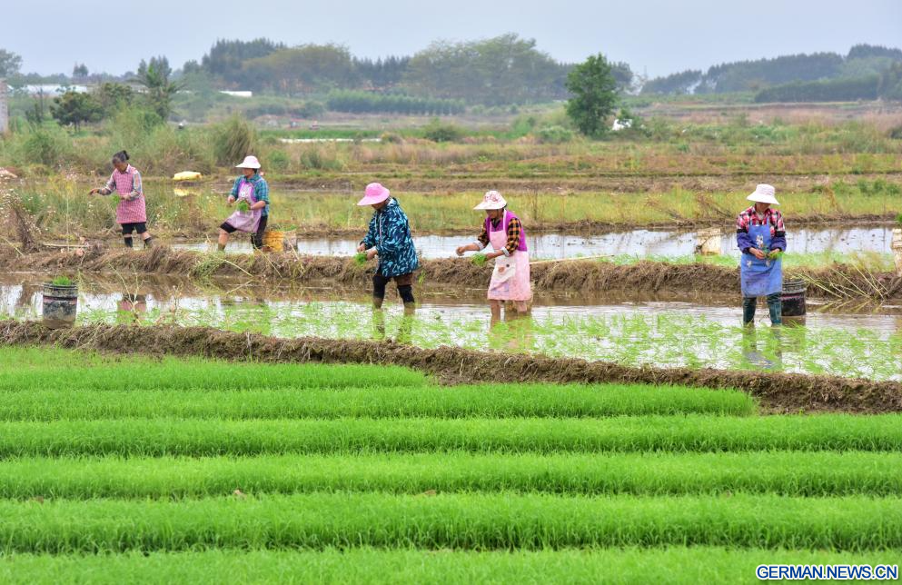 BEIJING, 9. April 2026 (Xinhuanet) -- Das Foto vom 8. April 2026 zeigt Bauern, die eine Landmaschine bei der Anpflanzung von Frühjahrsreis auf einem Feld in Yongzhou in der zentralchinesischen Provinz Hunan bedienen. (Foto von He Hongfu/Xinhua)