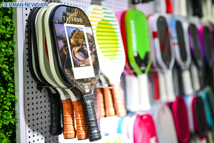 TAIZHOU, 11. April 2026 (Xinhua) -- Das Foto zeigt Pickleball-Schläger in der Ausstellungshalle eines Sportartikelherstellers in Linhai in der Stadt Taizhou in der Provinz Zhejiang in Ostchina, 10. April 2026. In den letzten Jahren hat die Stadt Taizhou die Clusterbildung in ihrer Sportartikelindustrie gefördert. Dabei wurden mehrere Cluster gebildet, darunter Outdoor-Jacken, Outdoor-Freizeitprodukte, Sportbrillen sowie Fahrrad- und damit verbundene Outdoor-Produkte. (Xinhua/Jiang Han)