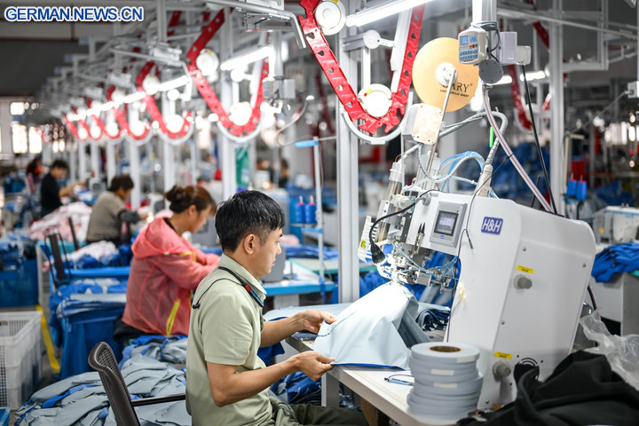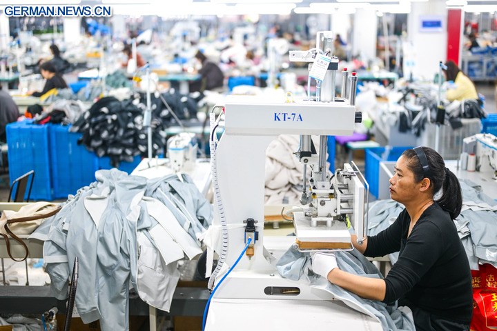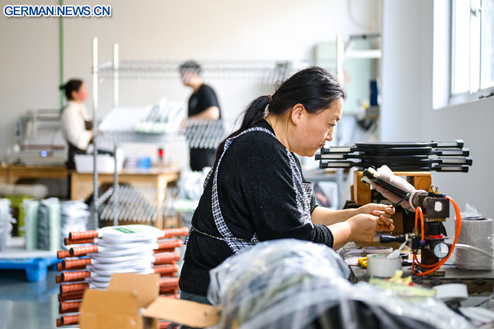 TAIZHOU, 11. April 2026 (Xinhua) -- Eine Angestellte arbeitet in einer Werkshalle eines Unternehmens im Kreis Sanmen der Stadt Taizhou in der Provinz Zhejiang in Ostchina, 10. April 2026. In den letzten Jahren hat die Stadt Taizhou die Clusterbildung in ihrer Sportartikelindustrie gefördert. Dabei wurden mehrere Cluster gebildet, darunter Outdoor-Jacken, Outdoor-Freizeitprodukte, Sportbrillen sowie Fahrrad- und damit verbundene Outdoor-Produkte. (Xinhua/Jiang Han)