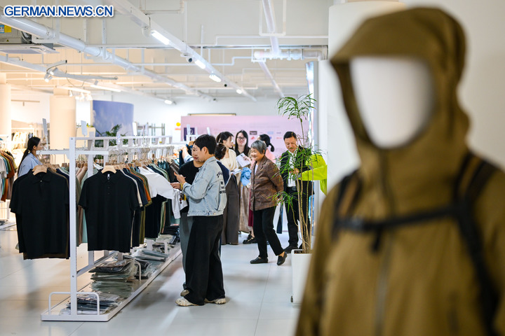 TAIZHOU, 11. April 2026 (Xinhua) -- Menschen shoppen in der Ausstellungshalle eines Unternehmens im Kreis Sanmen der Stadt Taizhou in der Provinz Zhejiang in Ostchina, 10. April 2026. In den letzten Jahren hat die Stadt Taizhou die Clusterbildung in ihrer Sportartikelindustrie gefördert. Dabei wurden mehrere Cluster gebildet, darunter Outdoor-Jacken, Outdoor-Freizeitprodukte, Sportbrillen sowie Fahrrad- und damit verbundene Outdoor-Produkte. (Xinhua/Jiang Han)