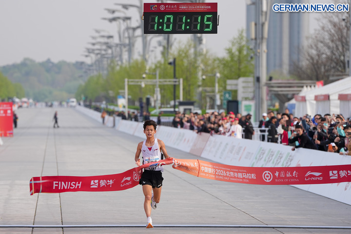 BEIJING, 12. April 2026 (Xinhua) -- Wang Wenjie aus China überquert die Ziellinie und gewinnt den Titel bei den Männern beim Beijing-Halbmarathon 2026 in der chinesischen Hauptstadt Beijing, 12. April 2026. (Xinhua/Ju Huanzong)
