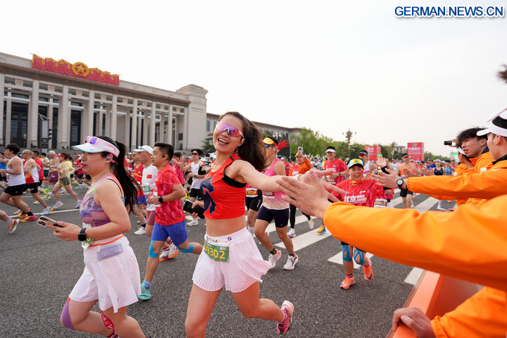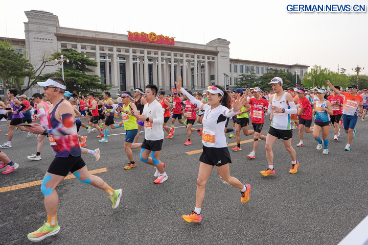 BEIJING, 12. April 2026 (Xinhua) -- Teilnehmer passieren das Nationalmuseum Chinas während des Beijing-Halbmarathons 2026 in der chinesischen Hauptstadt Beijing, 12. April 2026. (Xinhua/Ju Huanzong)