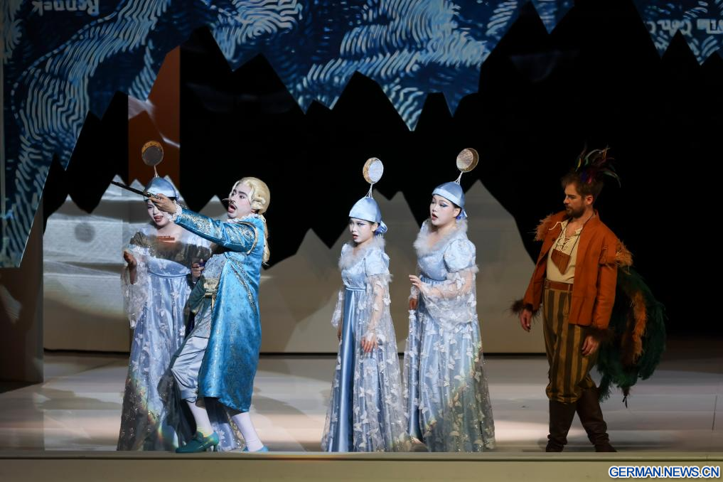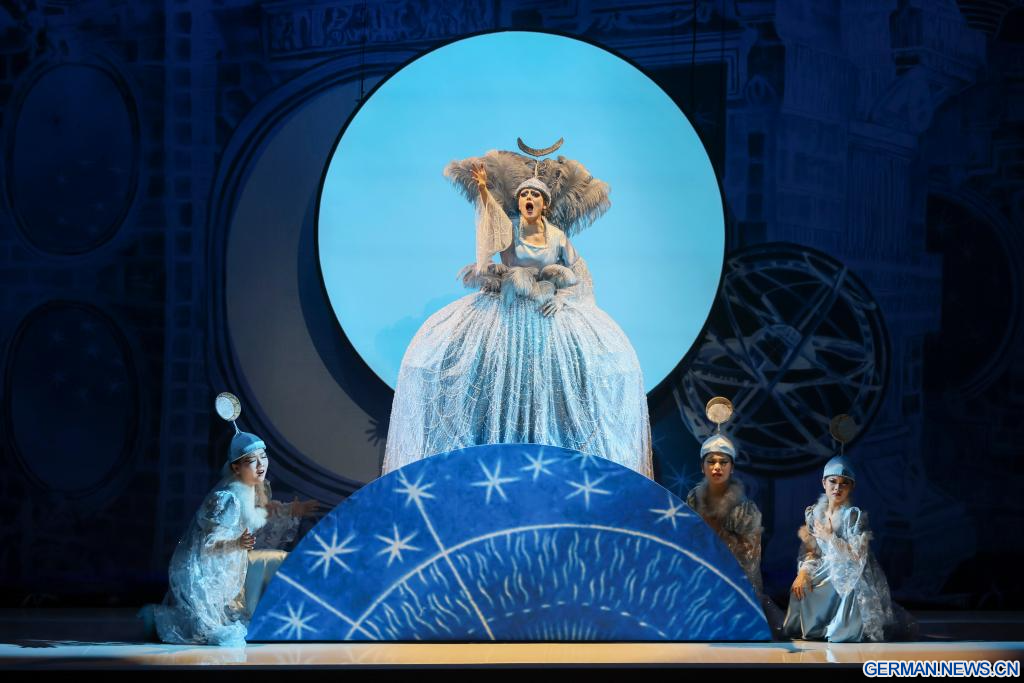 SHANGHAI, 12. April 2026 (Xinhuanet) -- Darsteller führen die Oper „Die Zauberflöte“ des österreichischen Musikers Wolfgang Amadeus Mozart während der Abschlussvorstellung des 41. Internationalen Musikfestivals „Shanghai Spring“ in Shanghai in Ostchina auf, 12. April 2026. (Quelle: Xinhua/Wang Xiang)