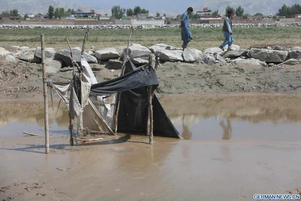 KABUL, 14. April 2026 (Xinhuanet) -- Das am 13. April 2026 aufgenommene Foto zeigt eine Szene in einem vom Hochwasser betroffenen Gebiet in der Provinz Nangarhar in Afghanistan. In den vergangenen 18 Tagen seien fast 200 Menschen durch Regenstürme und Überschwemmungen in ganz Afghanistan ums Leben gekommen, wie ein Sprecher der nationalen Katastrophenschutzbehörde des Landes mitteilte. (Foto von Saifurahman Safi/Xinhua)