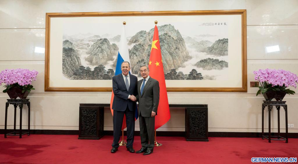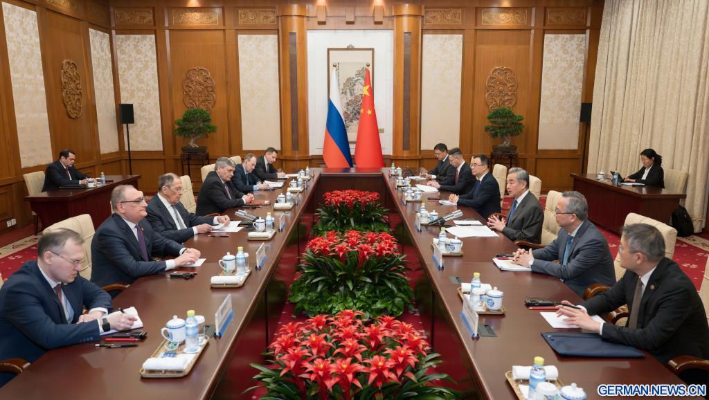 BEIJING, 14. April 2026 (Xinhuanet) -- Der chinesische Außenminister Wang Yi, ebenfalls Mitglied des Politbüros des Zentralkomitees der Kommunistischen Partei Chinas, führt Gespräche mit dem russischen Außenminister Sergej Lawrow in Chinas Hauptstadt Beijing, 14. April 2026. (Quelle: Xinhua/Cai Yang)