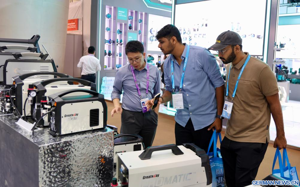 GUANGZHOU, 15. April 2026 (Xinhuanet) -- Ausländische Käufer informieren sich über einen Staubsauger auf der 139. Chinesischen Import- und Exportmesse in Guangzhou in der südchinesischen Provinz Guangdong, 15. April 2026. (Quelle: Xinhua/Lu Hanxin)