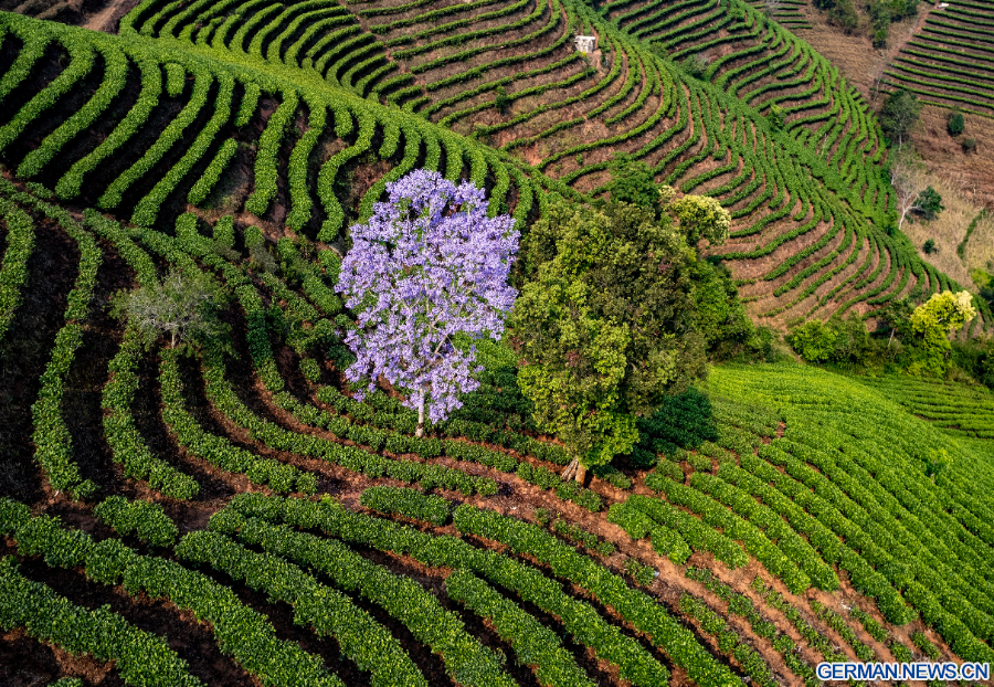 PU'ER, 16. April 2026 (Xinhua) -- Die Luftaufnahme einer Drohne zeigt einen Teegarten im Bezirk Simao der Stadt Pu'er in der Provinz Yunnan im Südwesten Chinas, 15. April 2026. (Xinhua/Chen Xinbo)