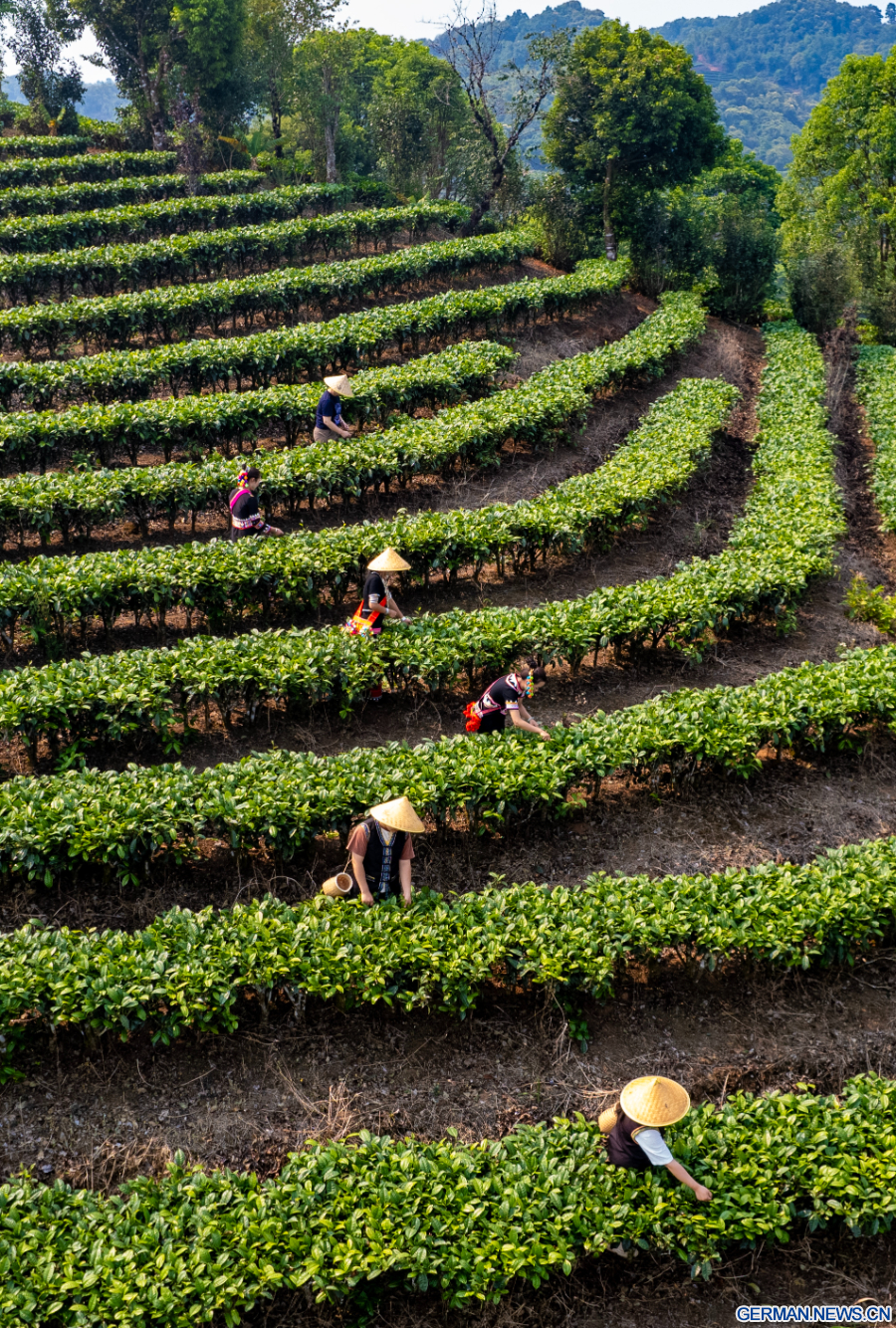 PU'ER, 16. April 2026 (Xinhua) -- Die Luftaufnahme einer Drohne zeigt Landwirte beim Pflücken von Teeblättern in einem Teegarten im Bezirk Simao der Stadt Pu'er in der Provinz Yunnan im Südwesten Chinas, 15. April 2026. (Xinhua/Chen Xinbo)