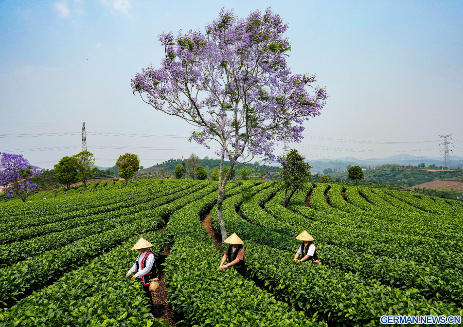 PU'ER, 16. April 2026 (Xinhua) -- Landwirtinnen pflücken Teeblätter in einem Teegarten im Bezirk Simao der Stadt Pu'er in der Provinz Yunnan im Südwesten Chinas, 15. April 2026. (Xinhua/Chen Xinbo)