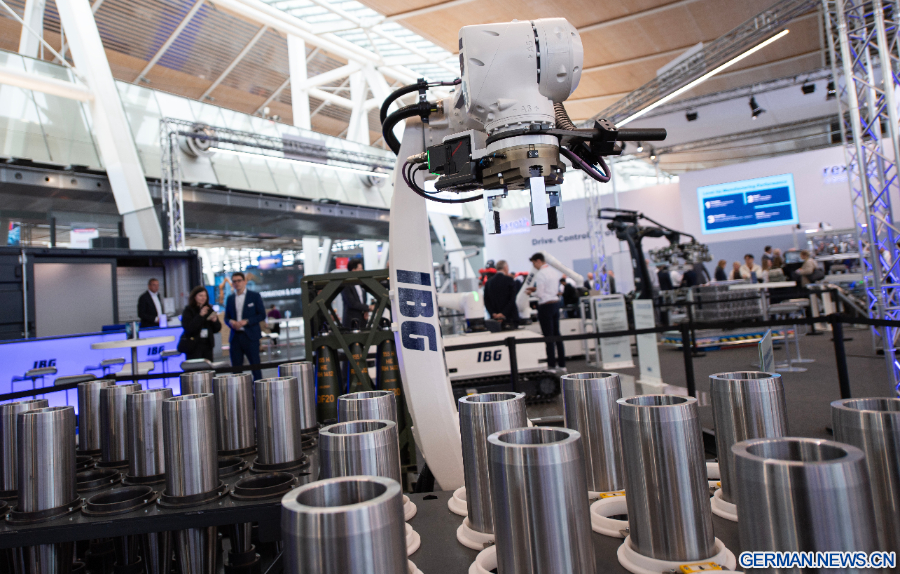 HANNOVER, 21. April 2026 (Xinhua) -- Das Foto zeigt einen Industrieroboterarm auf der Hannover Messe 2026, 20. April 2026.