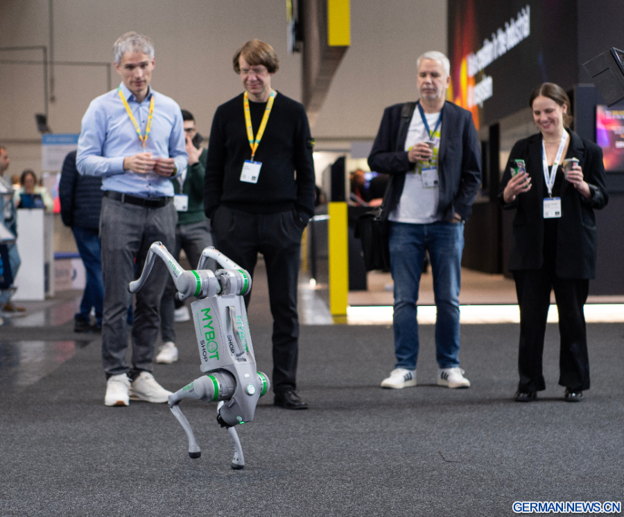 HANNOVER, 21. April 2026 (Xinhua) -- Menschen betrachten einen Roboterhund auf der Hannover Messe 2026, 20. April 2026.