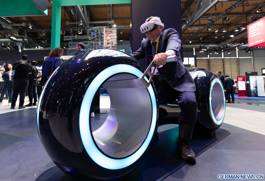 HANNOVER, 21. April 2026 (Xinhua) -- Ein Mitarbeiter demonstriert ein VR-gestütztes Produkt auf der Hannover Messe 2026, 20. April 2026.