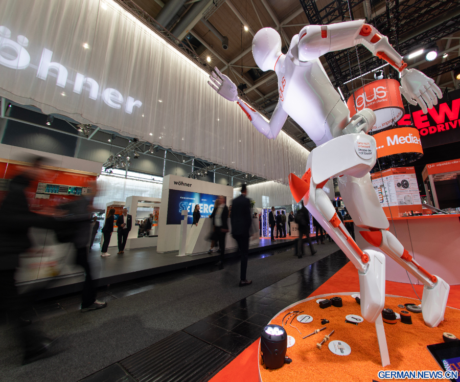 HANNOVER, 21. April 2026 (Xinhua) -- Ein Mann betrachtet einen humanoiden Roboter im Ausstellungsbereich von Agile Robots auf der Hannover Messe 2026, 20. April 2026.