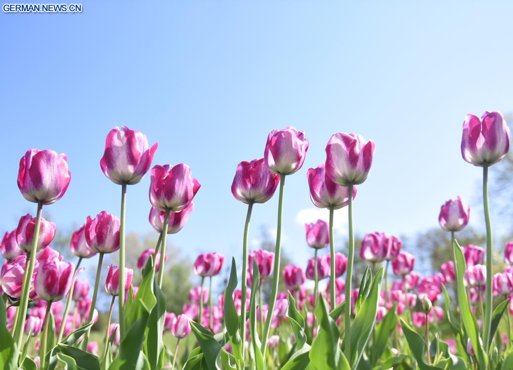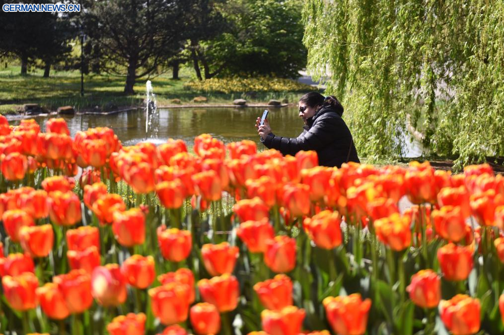 WIEN, 22. April 2026 (Xinhuanet) -- Das Foto zeigt blühende Tulpen in einem Park in Wien, Österreich, 22. April 2026. (Foto von Han Lu/Xinhua)