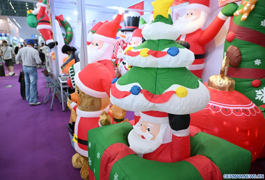 GUANGZHOU, 23. April 2026 (Xinhuanet) -- Weihnachtsdekorationen sind auf der 139. Chinesischen Import- und Exportmesse (Kanton-Messe) in Guangzhou in der südchinesischen Provinz Guangdong ausgestellt, 23. April 2026. Die zweite Phase der 139. Kanton-Messe begann hier am Donnerstag.
