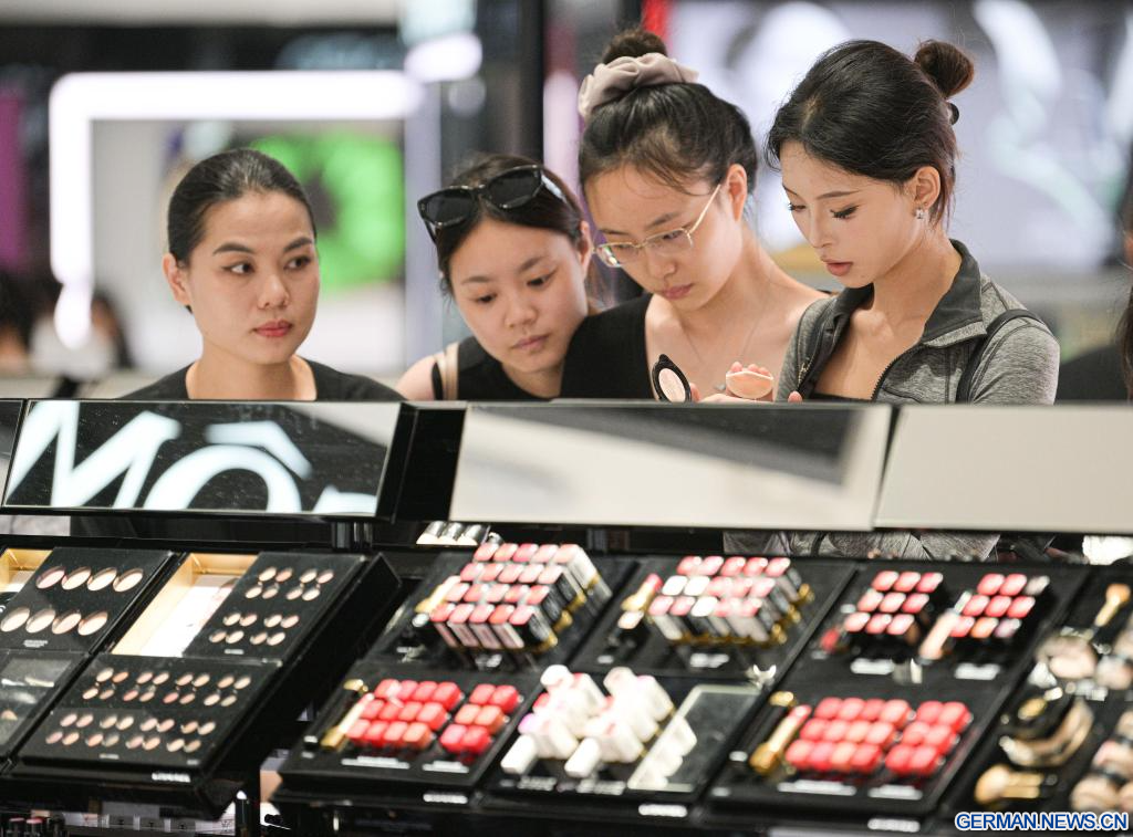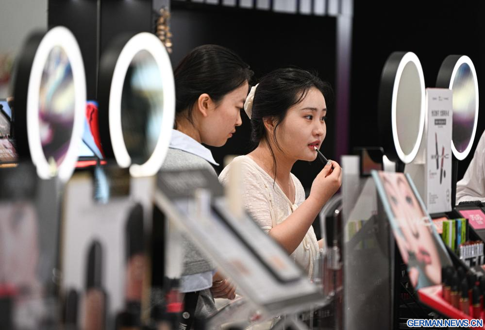 HAIKOU, 26. April 2026 (Xinhuanet) -- Eine Kundin probiert in einem Duty-Free-Shop in Haikou in der südchinesischen Provinz Hainan Make-up-Produkte aus, 25. April 2026. (Quelle: Xinhua/Pu Xiaoxu)