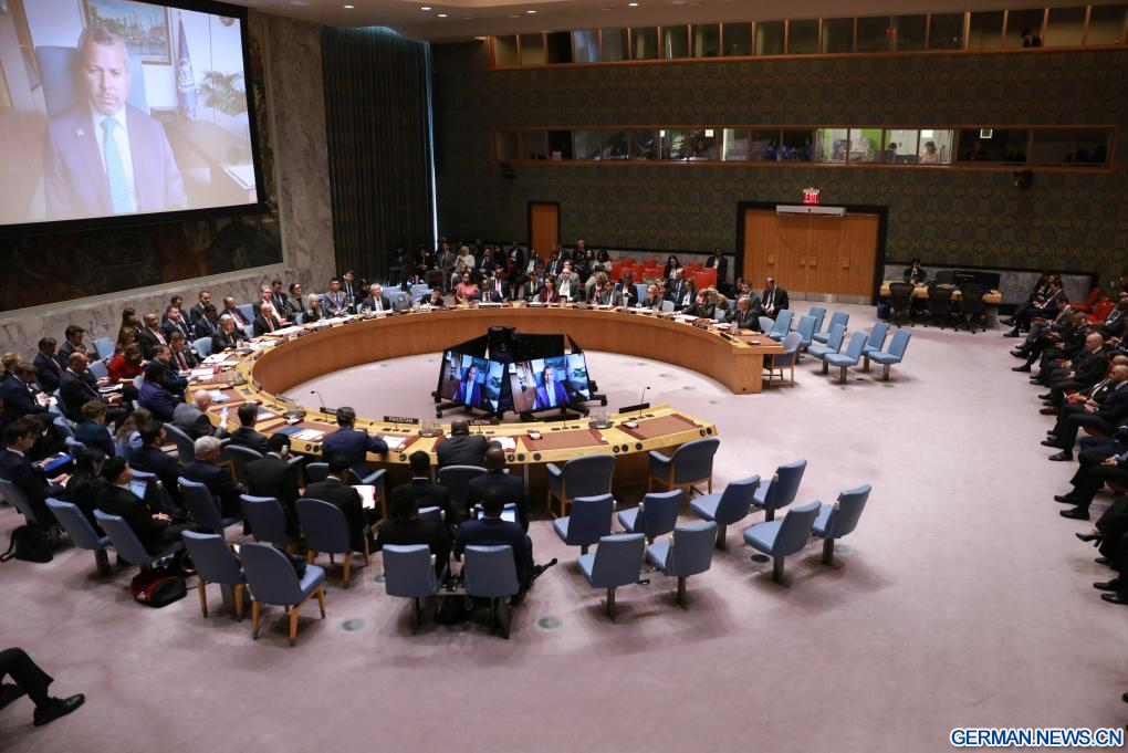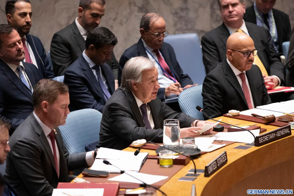 VEREINTE NATIONEN, 27. April 2026 (Xinhuanet) -- Der UN-Sicherheitsrat hält im UN-Hauptquartier in New York eine öffentliche Debatte über die Sicherheit und den Schutz der Wasserwege im maritimen Bereich ab, 27. April 2026. Der UN-Generalsekretär Antonio Guterres rief am Montag bei einer öffentlichen Debatte des Sicherheitsrats über die Sicherheit und den Schutz der Wasserwege im maritimen Bereich dazu auf, die Straße von Hormus wieder zu öffnen. (Quelle: Xinhua/Xie E)
