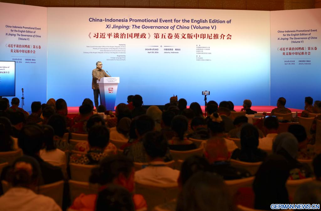 JAKARTA, 28. April (Xinhua) -- Am Dienstag fand in Jakarta eine Werbeveranstaltung für die englische Ausgabe des fünften Bandes der Reihe „Xi Jinping: China regieren“ statt.