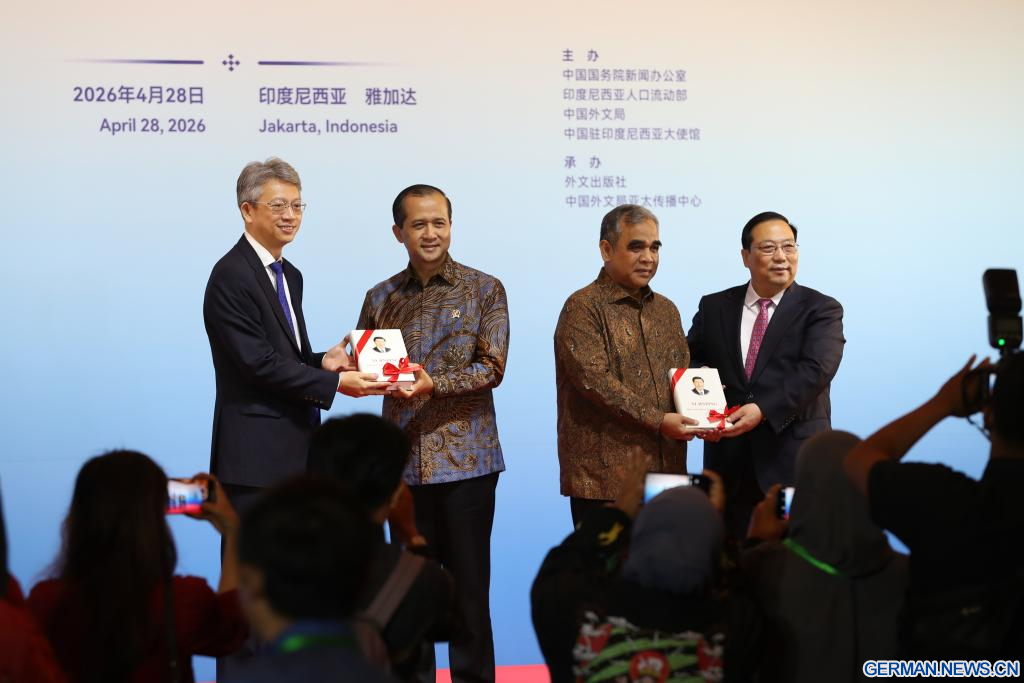Exemplare der englischen Ausgabe des fünften Bandes der Reihe „Xi Jinping: China regieren“ werden den indonesischen Gästen bei einer Werbeveranstaltung in Jakarta, Indonesien, überreicht, 28. April 2026. Am Dienstag fand in Jakarta eine Werbeveranstaltung für die englische Ausgabe des fünften Bandes der Reihe „Xi Jinping: China regieren“ statt. (Quelle: Xinhua/Cen Yunpeng)