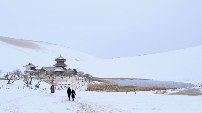 Touristen besuchen Landschaftsgebiet Mingsha-Berg und Mondsichelquelle in Stadt Dunhuang im Nordwesten Chinas