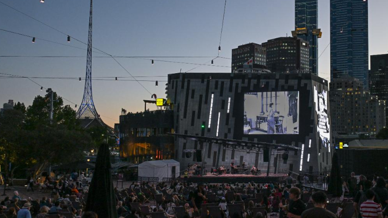 Zuschauer sehen sich klassischen chinesischen Stummfilm auf Federation Square in Melbourne an