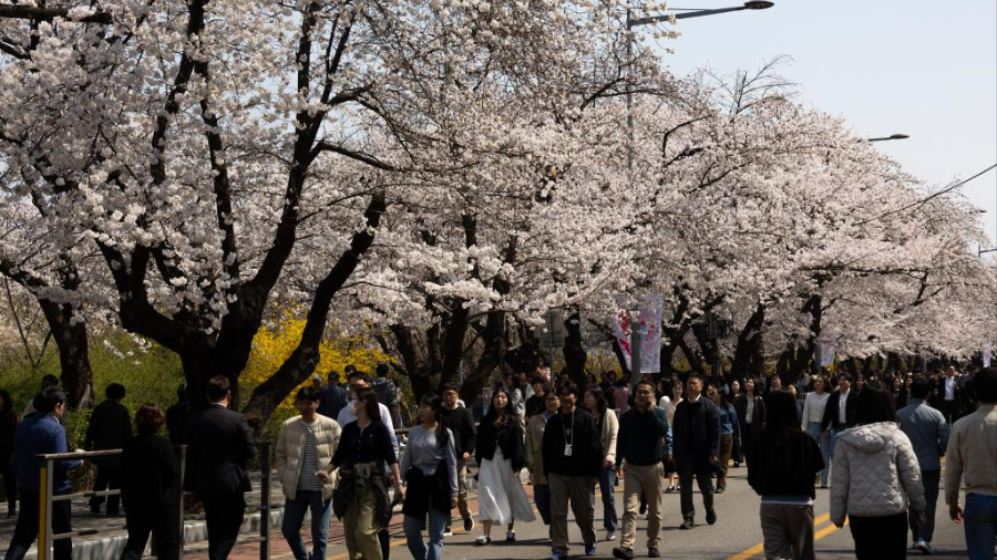 Menschen erfreuen sich an Kirschblüten in Seoul, Südkorea