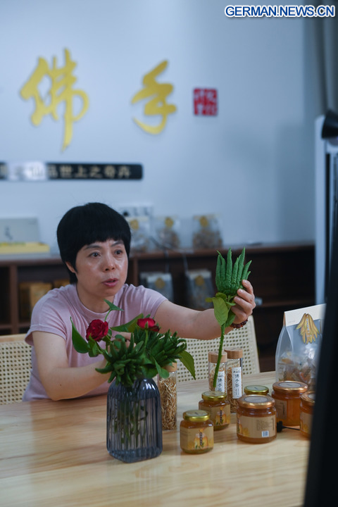 JINHUA, 20. Juni 2023 (Xinhua) -- Eine Landwirtin vermarktet Produkte aus Fingerzitronen per Livestreaming aus dem Dorf Beishankou in der Gemeinde Chisong im Bezirk Jindong der Stadt Jinhua in der Provinz Zhejiang in Ostchina, 20. Juni 2023. Basierend auf der Verflechtung von Tourismus und Landwirtschaft hat der Bezirk Jindong in seinen Verwaltungsdörfern einen Entwicklungsgürtel für die Wirtschaft in ländlichen Gebieten gefördert, der sich durch charakteristische Gewerbe auszeichnet. (Xinhua/Xu Yu)