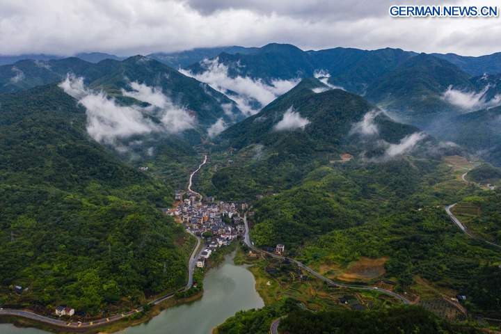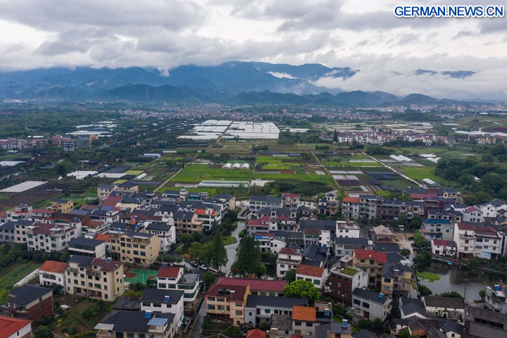 JINHUA, 20. Juni 2023 (Xinhua) -- Die Luftaufnahme zeigt das Dorf Dayuan in der Gemeinde Chisong im Bezirk Jindong der Stadt Jinhua in der Provinz Zhejiang in Ostchina, 20. Juni 2023. Basierend auf der Verflechtung von Tourismus und Landwirtschaft hat der Bezirk Jindong in seinen Verwaltungsdörfern einen Entwicklungsgürtel für die Wirtschaft in ländlichen Gebieten gefördert, der sich durch charakteristische Gewerbe auszeichnet. (Xinhua/Xu Yu)