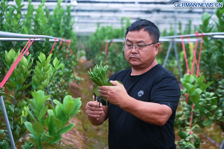 JINHUA, 20. Juni 2023 (Xinhua) -- Ein Landwirt kontrolliert das Wachstum von Zitronenpflanzen, die fingerförmige Früchte ausbilden (Fingerzitronen), auf einer Plantage im Dorf Beishankou in der Gemeinde Chisong im Bezirk Jindong der Stadt Jinhua in der Provinz Zhejiang in Ostchina, 20. Juni 2023. Basierend auf der Verflechtung von Tourismus und Landwirtschaft hat der Bezirk Jindong in seinen Verwaltungsdörfern einen Entwicklungsgürtel für die Wirtschaft in ländlichen Gebieten gefördert, der sich durch charakteristische Gewerbe auszeichnet. (Xinhua/Xu Yu)