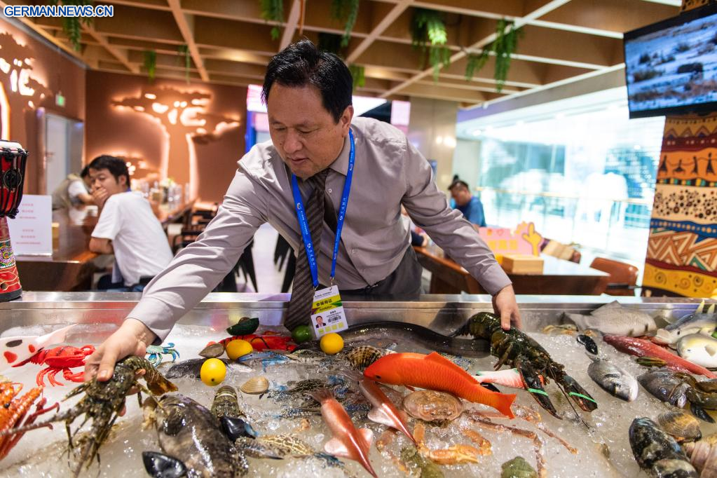CHANGSHA, 1. Juli 2023 (Xinhuanet) -- Ein Aussteller arrangiert afrikanische Meeresfrüchte im China-Africa Economic and Trade Cooperation Promotion Innovation Demonstration Park (Hunan Gaoqiao Grand Market) in Changsha in der zentralchinesischen Provinz Hunan, 1. Juli 2023. Die dritte chinesisch-afrikanische Wirtschafts- und Handelsmesse findet vom 29. Juni bis 2. Juli in Changsha statt. (Quelle: Xinhua/Chen Sihan)