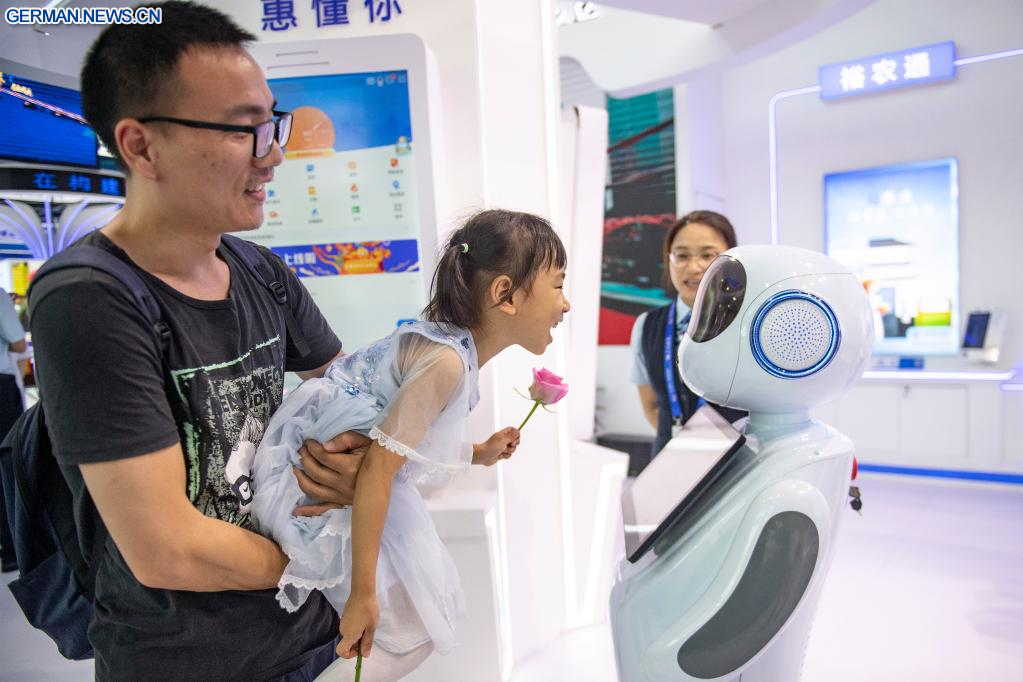 CHANGSHA, 1. Juli 2023 (Xinhuanet) -- Ein Mädchen interagiert mit einem Serviceroboter während der dritten chinesisch-afrikanischen Wirtschafts- und Handelsmesse in Changsha in der zentralchinesischen Provinz Hunan, 1. Juli 2023. Die dritte chinesisch-afrikanische Wirtschafts- und Handelsmesse findet vom 29. Juni bis 2. Juli in Changsha statt. (Quelle: Xinhua/Sun Ruibo)