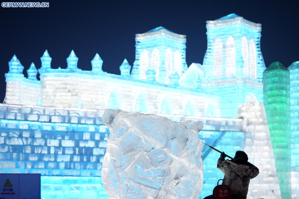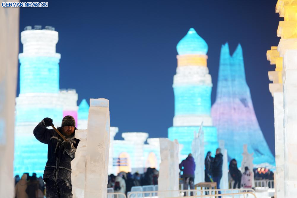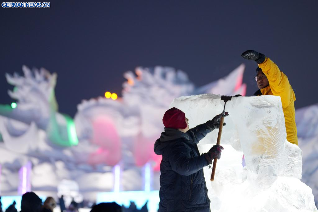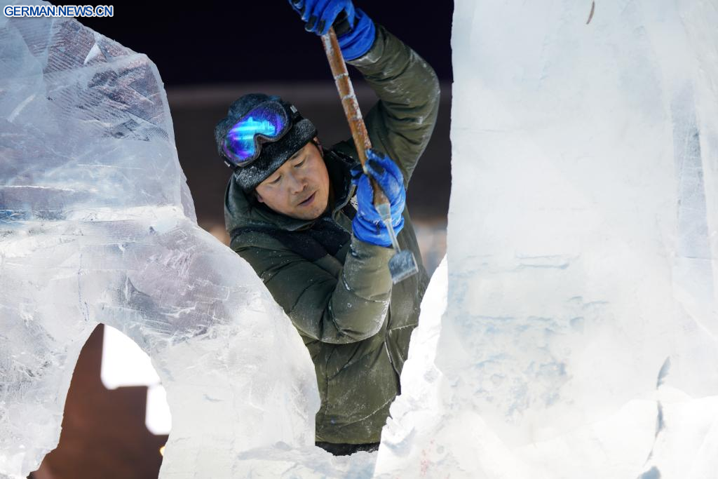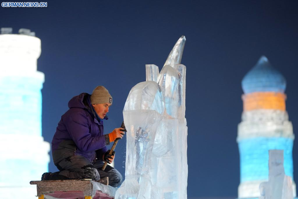 HARBIN, 2. Januar 2024 (Xinhuanet) -- Wettbewerber arbeiten an Eisskulpturen während des 35. Internationalen Eisskulpturen-Wettbewerbs in der Harbin Ice-Snow World in Harbin in der nordostchinesischen Provinz Heilongjiang, 2. Januar 2024. Der dreitägige Wettbewerb wurde hier am Dienstag eröffnet. (Quelle: Xinhua/Wang Jianwei)