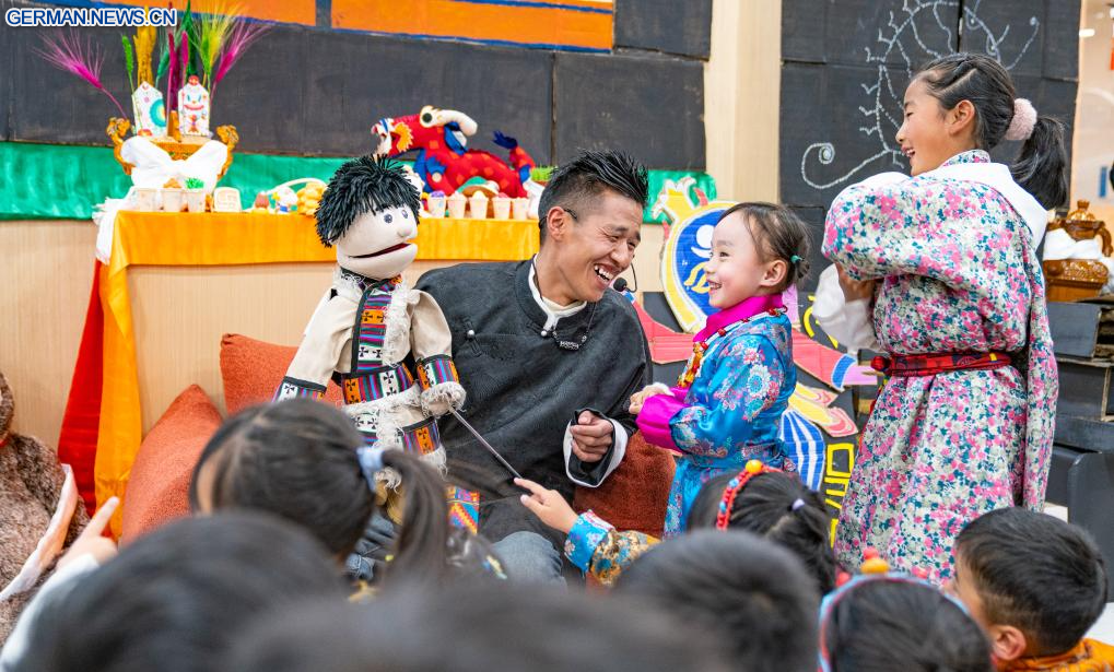 Am Samstag fand in einer Buchhandlung für Kinder in der Stadt Lhasa eine einzigartige Party statt, bei der Lehrer die traditionellen Bräuche des tibetischen Neujahrs vorstellten. Während der Veranstaltung genossen Kinder in traditionellen tibetischen Kostümen Musikdarbietungen, Puppentheater und die Herstellung von Kunsthandwerk sowie ein Festmahl mit "Gutu", einem traditionellen Suppengericht aus Mehl. (Foto von Tenzin Nyida/Xinhua)
