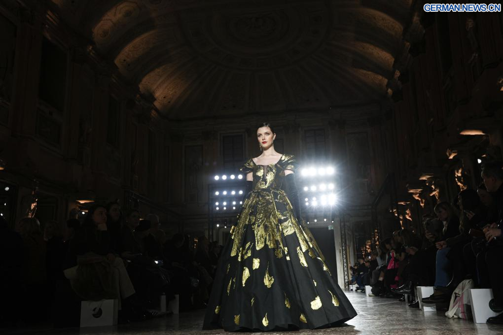 MAILAND, 24. Februar 2024 (Xinhuanet) -- Ein Model präsentiert eine Kreation der Nexy.Co-Kollektionen während des Shenzhen Futian Fashion Events im Palazzo Reale in Mailand, Italien, 23. Februar 2024. Die drei chinesischen Marken Kavon, Nexy.Co und Chlosio veranstalteten am Freitag ein gemeinsames Modeevent während der Mailänder Modewoche Herbst/Winter 2024/2025. (Quelle: Xinhua/Li Jing)