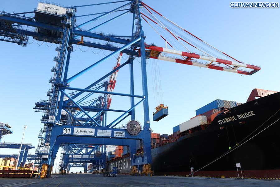 Das Foto zeigt das Entladen eines Containers von der „Istanbul Bridge“, dem ersten Schiff auf der Container-Expressroute zwischen China und Europa über die Arktis, im Hafen von Danzig in Polen, 19. Oktober 2025. (Xinhua/Cui Li)