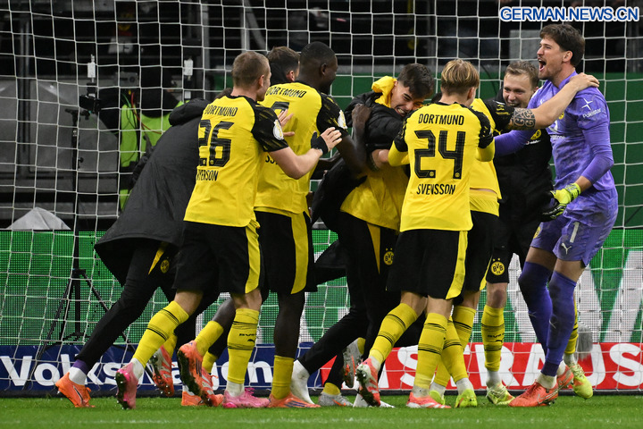FRANKFURT, 29. Oktober 2025 (Xinhua) -- Spieler von Borussia Dortmund feiern ihren Sieg in der Zweitrundenbegegnung des DFB-Pokals gegen Eintracht Frankfurt in Frankfurt, 28. Oktober 2025. (Foto von Ulrich Hufnagel/Xinhua)