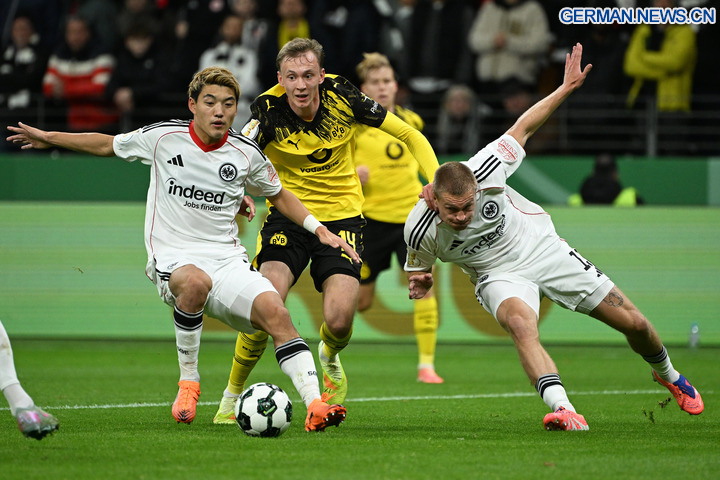 FRANKFURT, 29. Oktober 2025 (Xinhua) -- Das Foto zeigt Doan Ritsu (links) und Rasmus Kristensen (rechts) von Eintracht Frankfurt sowie Maximilian Beier von Borussia Dortmund im Zweikampf während der Zweitrundenbegegnung der beiden Teams im DFB-Pokal in Frankfurt, 28. Oktober 2025. (Foto von Ulrich Hufnagel/Xinhua)