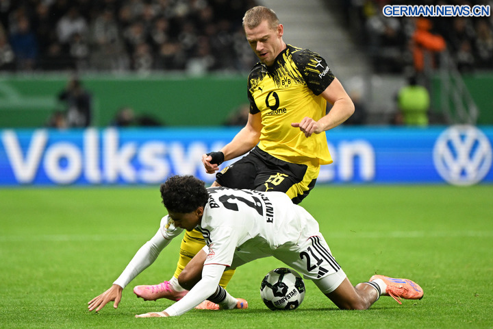 FRANKFURT, 29. Oktober 2025 (Xinhua) -- Das Foto zeigt Nathaniel Brown (unten) von Eintracht Frankfurt und Julian Ryerson von Borussia Dortmund im Zweikampf während der Zweitrundenbegegnung der beiden Teams im DFB-Pokal in Frankfurt, 28. Oktober 2025. (Foto von Ulrich Hufnagel/Xinhua)