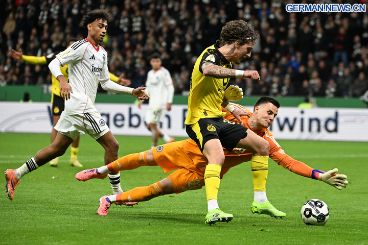 FRANKFURT, 29. Oktober 2025 (Xinhua) -- Michael Zetterer (rechts, hinten), Torwart von Eintracht Frankfurt, hält einen Ball während der Zweitrundenbegegnung im DFB-Pokal gegen Borussia Dortmund in Frankfurt, 28. Oktober 2025. (Foto von Ulrich Hufnagel/Xinhua)