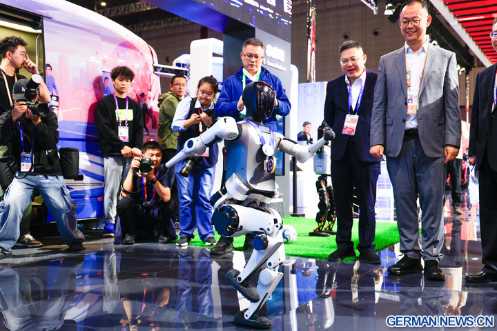 SHANGHAI, 6. November 2025 (Xinhua) -- Menschen beobachten die Vorführung eines Roboters im China-Pavillon auf der 8. Internationalen Importmesse Chinas (CIIE) in Shanghai in Ostchina, 5. November 2025. Die 8. Internationale Importmesse Chinas (CIIE) wurde am Mittwoch in Shanghai eröffnet. Zu den Höhepunkten des China-Pavillons zählen Chinas neueste Errungenschaften bei der umfassenden Vertiefung der Reformen und der Öffnung auf hohem Niveau während der Laufzeit des 14. Fünfjahresplans (2021-2025). (Xinhua/Liu Jiaqi)