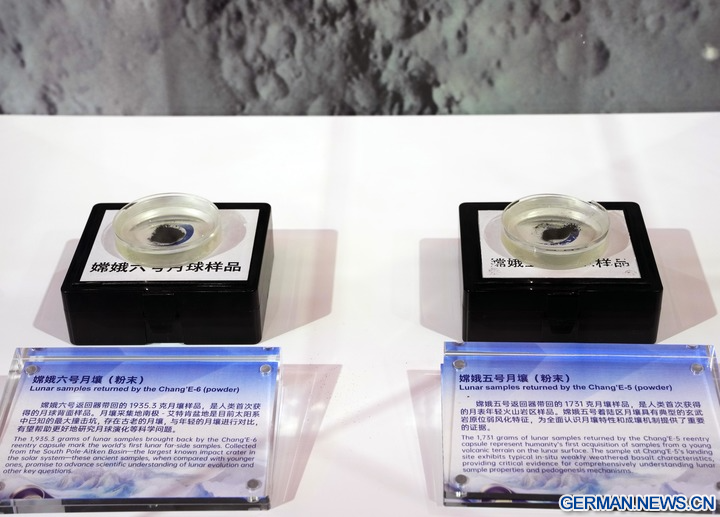 SHANGHAI, 6. November 2025 (Xinhua) -- Das Foto zeigt Mondproben, die von den chinesischen Missionen „Chang'e-5“ und „Chang'e-6“ gesammelt wurden, ausgestellt im China-Pavillon auf der 8. Internationalen Importmesse Chinas (CIIE) in Shanghai in Ostchina, 5. November 2025. Die 8. Internationale Importmesse Chinas (CIIE) wurde am Mittwoch in Shanghai eröffnet. Zu den Höhepunkten des China-Pavillons zählen Chinas neueste Errungenschaften bei der umfassenden Vertiefung der Reformen und der Öffnung auf hohem Niveau während der Laufzeit des 14. Fünfjahresplans (2021-2025). (Xinhua/Liu Ying)