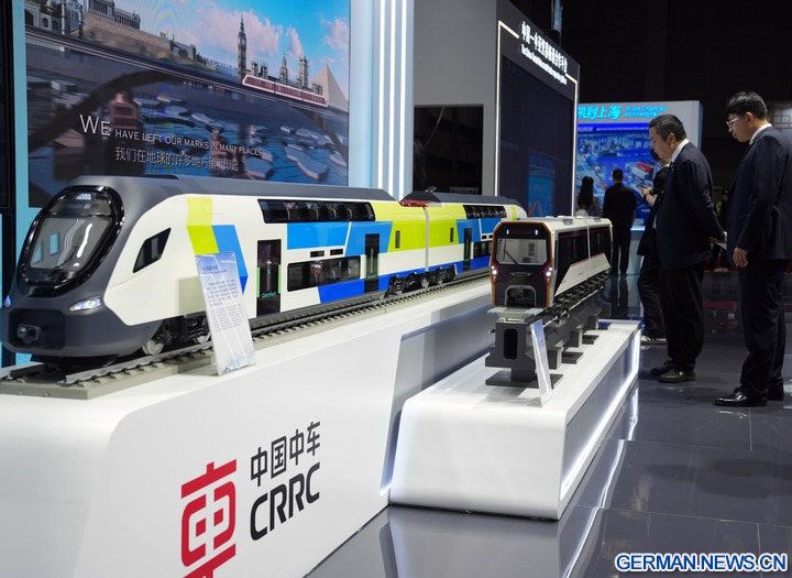 SHANGHAI, 6. November 2025 (Xinhua) -- Das Foto zeigt ein Modell eines doppelstöckigen elektrischen Triebzuges (EMU) und ein Modell eines Magnetschwebezuges, ausgestellt im China-Pavillon auf der 8. Internationalen Importmesse Chinas (CIIE) in Shanghai in Ostchina, 5. November 2025. Die 8. Internationale Importmesse Chinas (CIIE) wurde am Mittwoch in Shanghai eröffnet. Zu den Höhepunkten des China-Pavillons zählen Chinas neueste Errungenschaften bei der umfassenden Vertiefung der Reformen und der Öffnung auf hohem Niveau während der Laufzeit des 14. Fünfjahresplans (2021-2025). (Xinhua/Liu Ying)